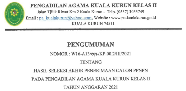 Berdasarkan Pengumuman Nomor : W16-A13/397/KP.00.2/III/2021 tanggal 24 Maret 2021 Tentang Hasil Seleksi Akhir Penerimaan Calon PPNPN pada Pengadilan Agama Kuala Kurun Kelas II Tahun Anggaran 2021.